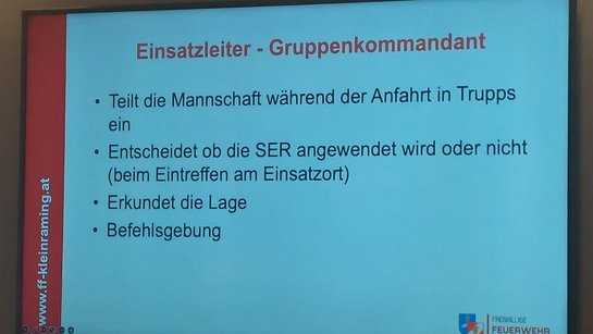 Kommandant Schwödiauer berichtete einleitend über die aktuellen Themen im Feuerwehrwesen und wechselte anschließend in seinen Vortrag zu Kaminbränden die momentan an Aktulität gewinnen. In seinen Ausführungen wurde über die Gefahren und die korrekte Vorgehensweise zur Brandbekämpfung hingewiesen. Im Anschluss referierte OBI Wimmer über die Standard Einsatzregel bei Verkehrsunfällen und zeigte das theoretisch erlangte Wissen auch gleich noch in einem anschaulichen Praxisbeispiel.