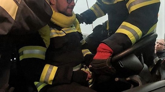Durch die Einschlung vom Florian mit der Rettungsboa (die gelbe Schlinge am Foto), ist eine Rettungs aus einem Kleinwagen für den Nacken schonend und bietet auch zusätzliche Griffmöglichkeiten.